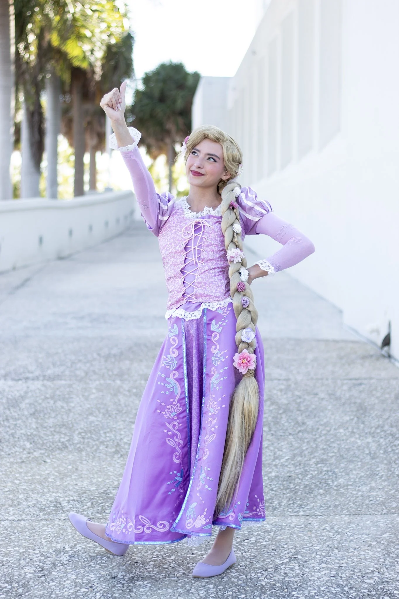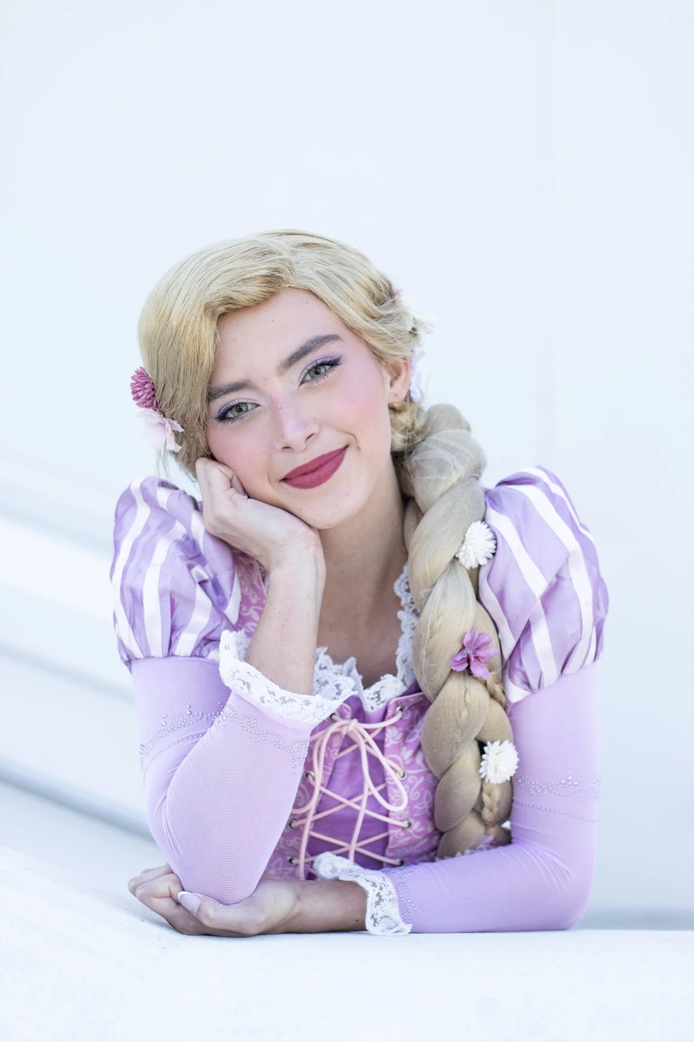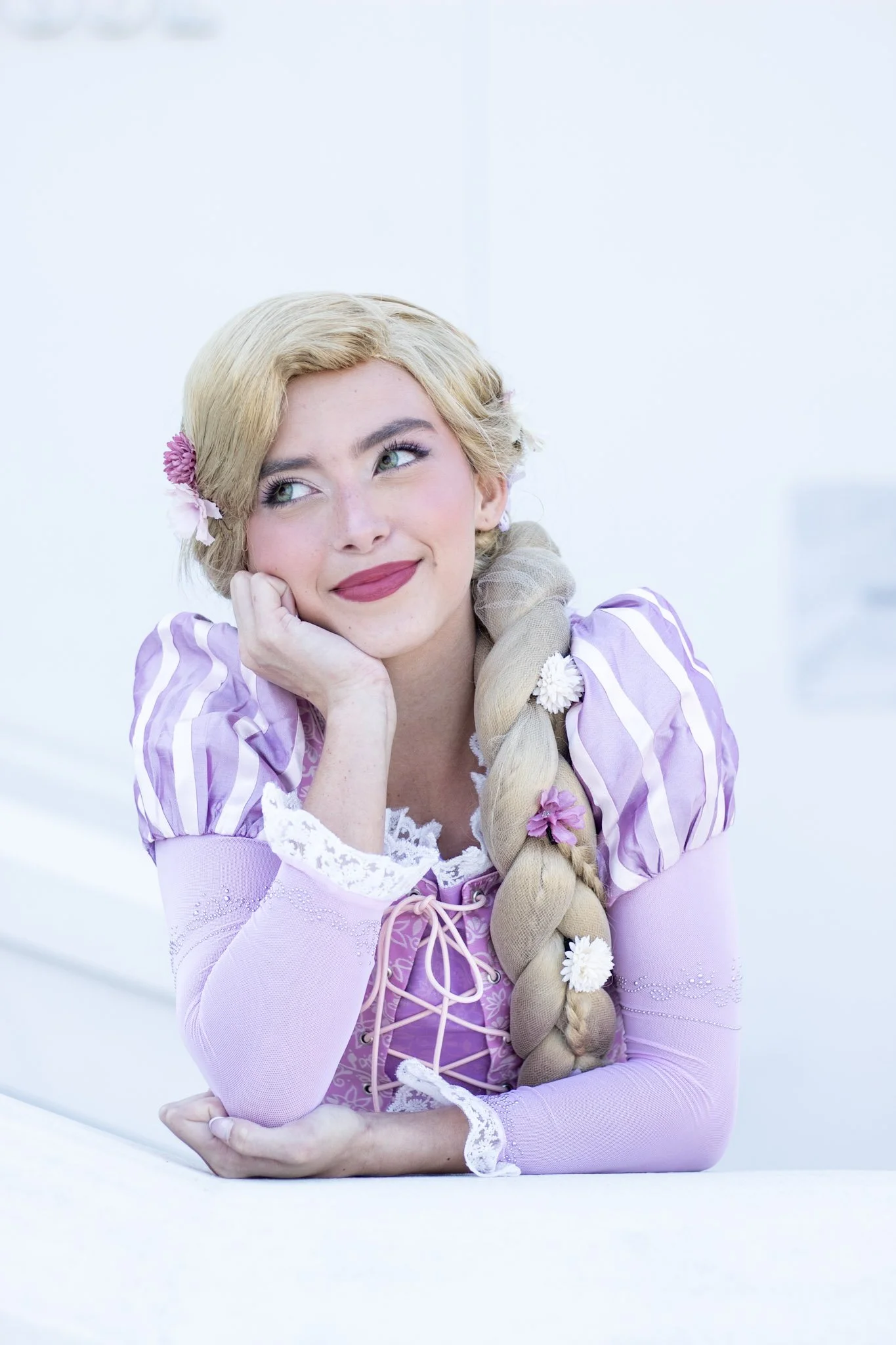 The Tower Princess is full of creativity, curiosity, and golden haired charm! After years in her tower, she’s ready to bring her favorite songs, games, and adventures to your event. She loves sharing stories about her daring journey, leading royal games, and teaching fun dance moves with her bright, bubbly spirit. With her sparkling gown and big heart, the Tower Princess makes every celebration feel magical and full of joy!